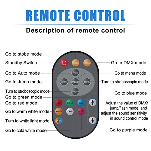 【5 modes de contrôle】 L’éclairage de scène dispose de 5 modes de contrôle : DMX512, maître-esclave, son, automatique et télécommande sans fil. Il permet également de régler la vitesse afin de répondre aux différents besoins des professionnels et des amateurs.