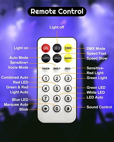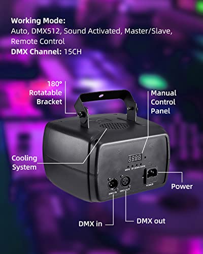 【Lumière de fête multifonctionnelle】La lumière de fête disco a de nombreux modes de fonctionnement : automatique, DMX512, activé par le son, maître/esclave et télécommande. Le mode activé par le son permet à la lumière de fête de changer les motifs d’éclairage en suivant le rythme de la musique. Avec la télécommande, vous pouvez contrôler la lumière de la scène à distance. Vous pouvez également utiliser le mode DMX 512 pour créer un effet d’éclairage de scène plus professionnel.