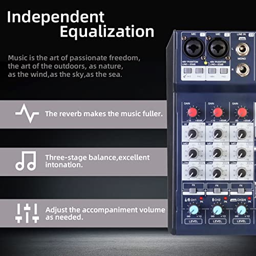 Voyants LED : le mélangeur d’enregistrement dispose de voyants LED et de clips de signal audio pour une facilité d’utilisation. Il dispose de la sélection d’entrée, boutons, maîtrise du volume, équilibre de canal indépendant et réglage des hautes, plus, basses fréquences